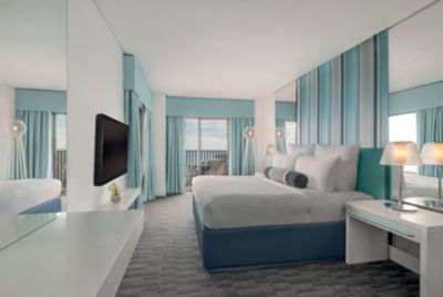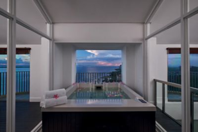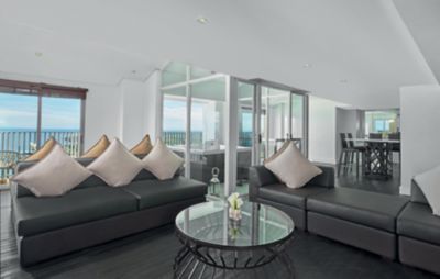 Set over two floors and 224 sqm of space, this penthouse suite has three bedrooms, private bathrooms, separate living and dining room, as well as a Jacuzzi.