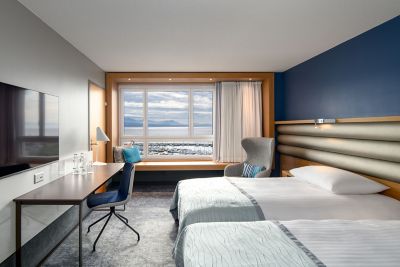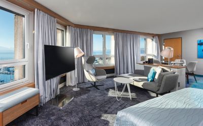 Thanks to their elevated position, our Deluxe Queen Bed Lake View Rooms offer some of the most beautiful views of Lake Geneva and the French Alps.