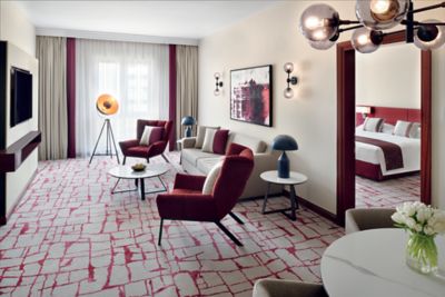 Take the Taxi and direct the driver to the Mövenpick Hotel & Apartments Bur Dubai opposite to the American Hospital in Dubai.