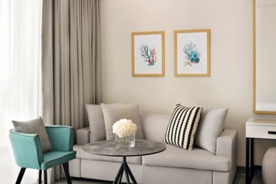 Start the day with a coffee from the in-room facilities or unwind with uninterrupted views enjoying a refreshment from the mini bar. These deluxe rooms feature stunning beach views and luxury amenities to make your stay at Mövenpick Resort Al Marjan Island unforgettable.