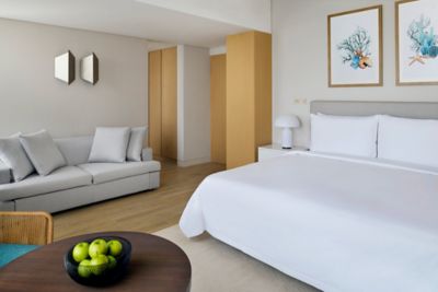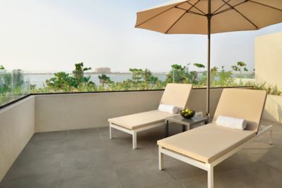 Revive beside the beach in a chalet-style Beachfront Junior Suite with Private Terrace, offering private comfort inside and out. Prepare for the excitement and entertainment of Al Marjan Island by staying in this luxury suite, featuring a 27 sqm sun terrace, a comfortable king-size bed with the finest linen, a 55-inch LED TV, and high-speed, complimentary Wi-Fi.